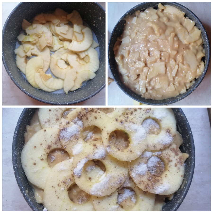 Vul de vorm met het beslag, verdeel de apart gehouden appelplakjes erover, bestrooi met kaneel en, als je wilt, met twee theelepels suiker. Schud lichtjes op het werkblad om luchtbellen te verwijderen en de appels te compacteren.