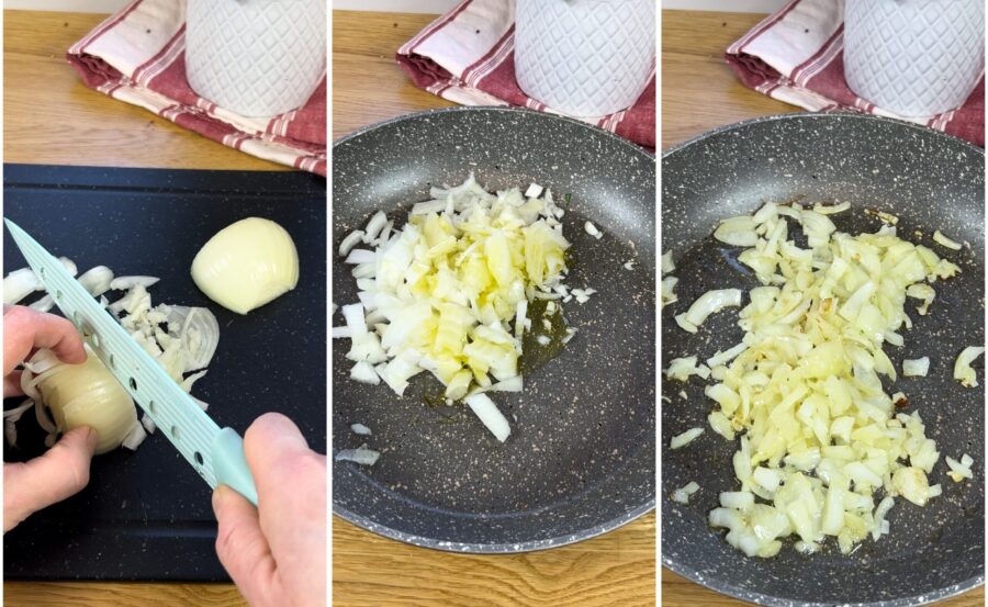 Schil en hak de ui, laat deze zachtjes fruiten met een royale scheut olie, voeg de artisjokharten toe en laat een paar minuten meebakken terwijl je regelmatig roert.