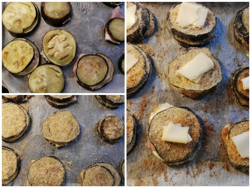 • Onze auberginemedaillons uit de oven met ham en kaas zijn klaar om te serveren, nog warm en kleverig: je zult zien, ze zijn heerlijk!
