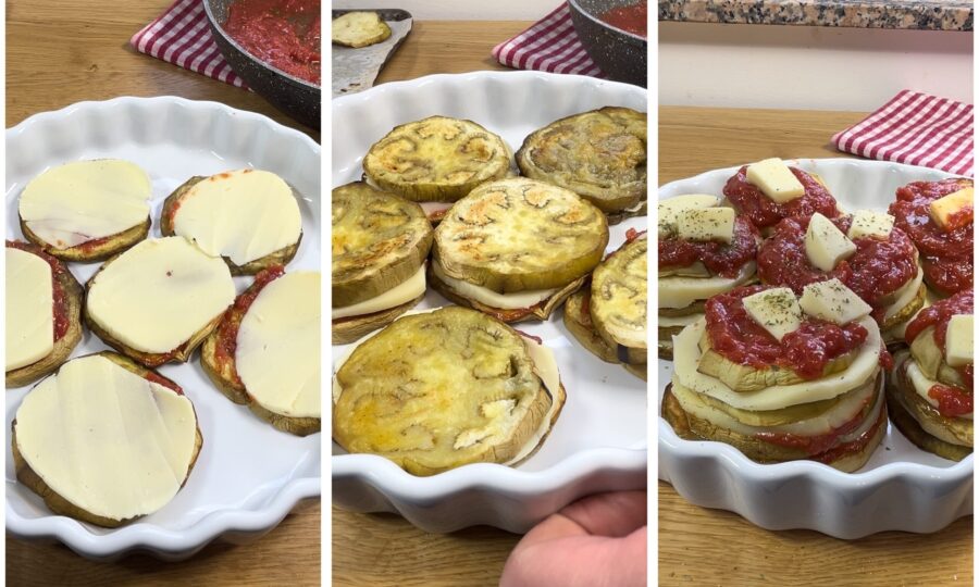 Een plak kaas en dan weer een plak aubergine. Herhaal en wissel de lagen af tot de ingrediënten op zijn. Ik maakte 6 porties met 4 plakken aubergine en 3 plakken kaas. Eindig elke portie met tomaat, blokjes kaas en een snufje oregano.