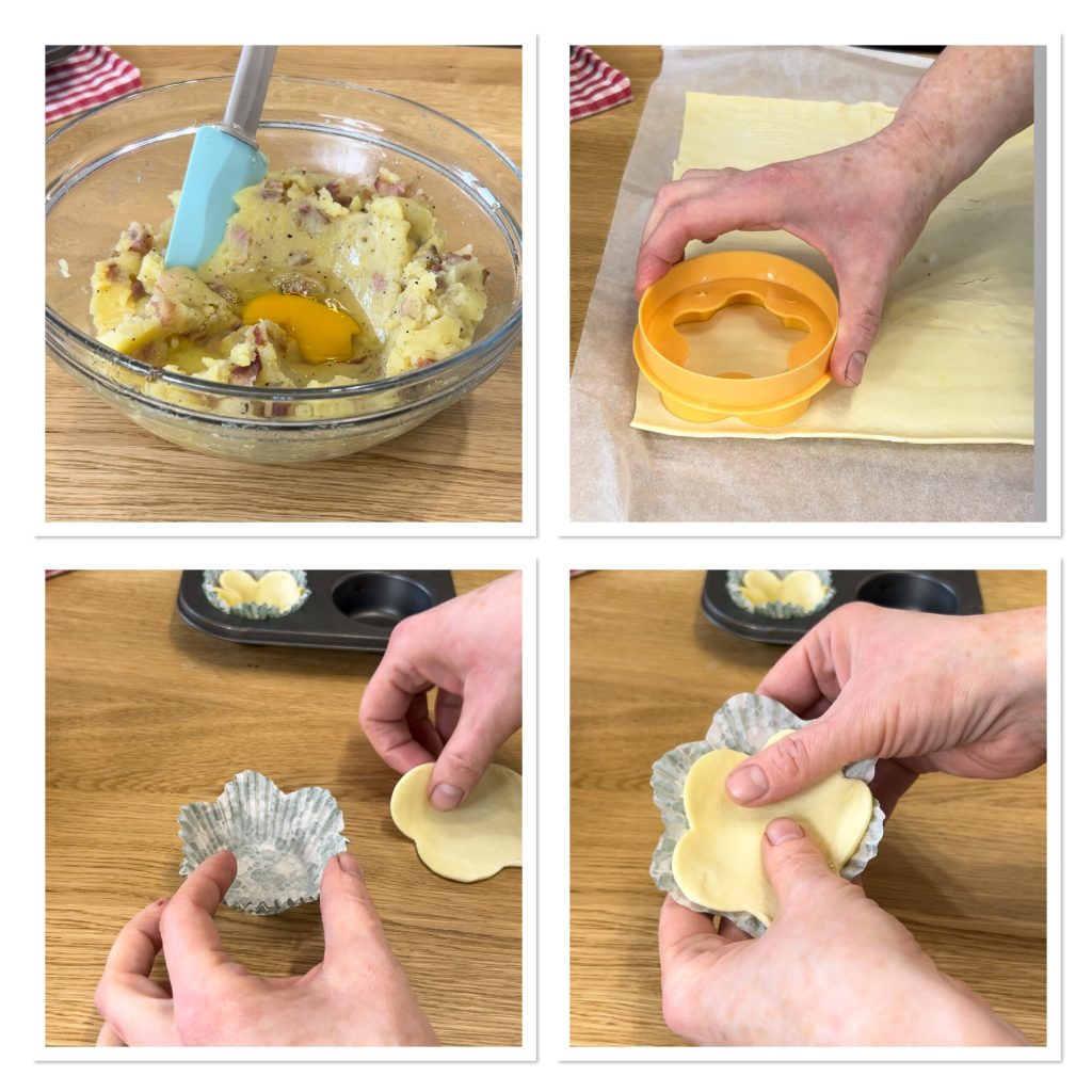 Stappen voor het maken van bladerdeegmandjes met aardappelen en guanciale