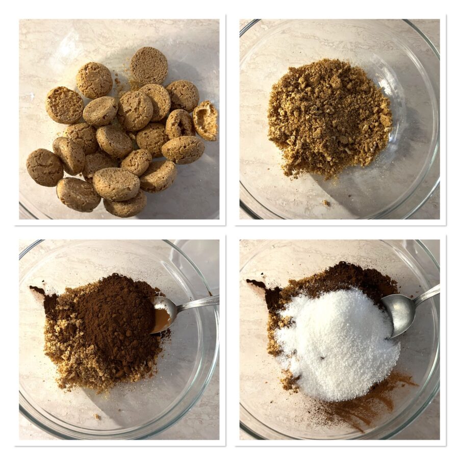 Verkruimel de amaretti en doe ze in een kom, voeg het ongezoete cacaopoeder en de suiker toe.