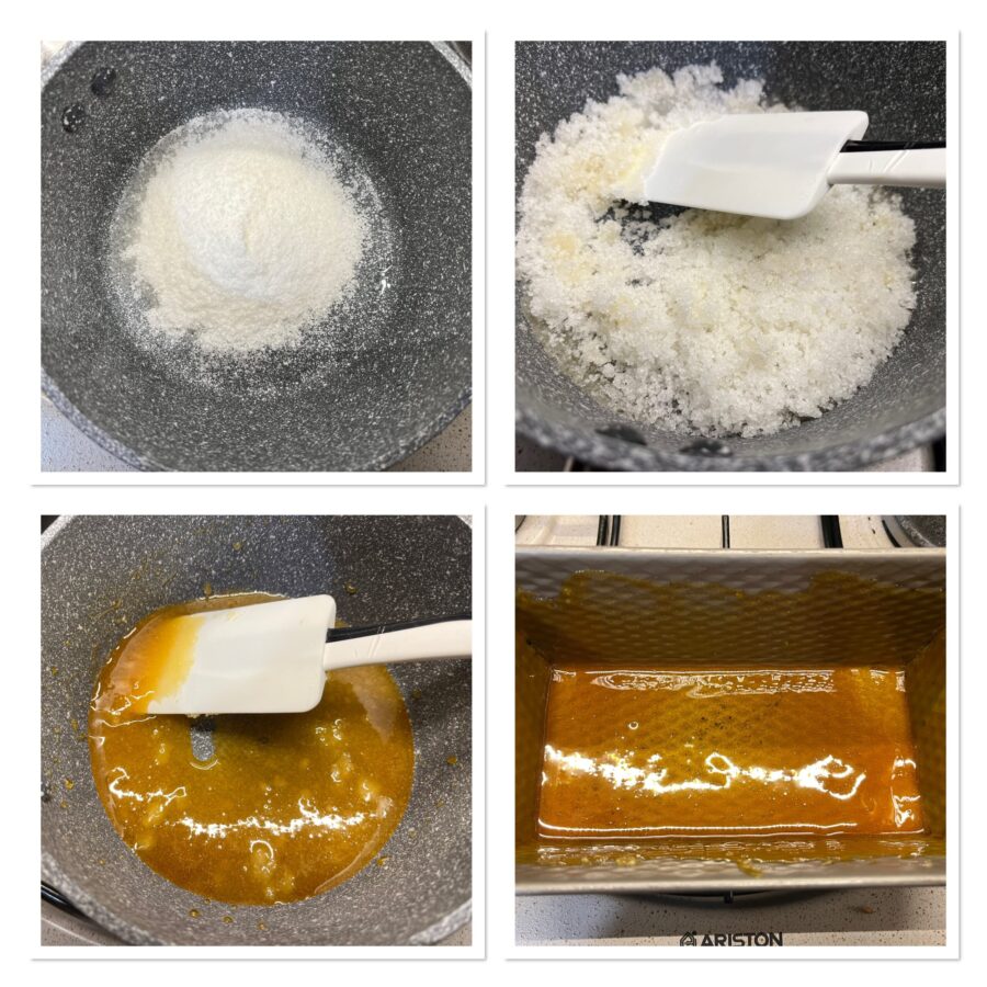 Doe de suiker in een kleine pan met dikke bodem, bij voorkeur anti-aanbak, voeg het water toe en zet op laag vuur. Roer constant met een siliconen spatel of houten lepel totdat de suiker smelt, giet het dan in de vorm en bestrijk met behulp van de spatel ook de randen met karamel tot halfhoogte. Suiker smelt bij 186°C; WEES VOORZICHTIG BIJ HET HANDELEN EN BIJ HET VASTPAKKEN VAN DE VORM, die meteen heel heet wordt — wees snel want de karamel hardt snel uit.