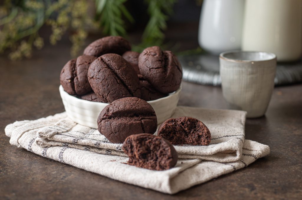 Cacaokoekjes met koffie, het grootmoeders recept voor zanddeegkoekjes, maar dan met chocolade! De cacaokoekjes met koffie, heerlijk op zichzelf en verrukkelijk om in melk te dippen, maken deel uit van onze verzameling Tante ricette per biscotti buonissimi. Ze zijn smaakvol, geurig, verslavend en perfect om te genieten bij het ontbijt, als tussendoortje en zelfs tijdens de koffiepauze. Rijk aan cacao en met een vulling van pure chocolade, vragen deze koekjes om het gebruik van espresso en oploskoffie (bij voorkeur cafeïnevrij) direct in het deeg, wat ze een bijzonder aroma geeft. Deze zachte koekjes, vergelijkbaar met de beroemde Crinkle cookies al cioccolato, zijn het perfecte idee om jong en oud blij te maken. Het recept is eenvoudig en heel snel, ook omdat deze verrukkelijke cacaokoekjes zonder vormpjes gemaakt worden en je er niet eens een werkblad of deegroller voor nodig hebt. Koekjes die je ook met kinderen kunt maken, ze hebben een karakteristieke koffieboonvorm die ze extra aantrekkelijk maakt, en een lekkere vulling van pure chocolade in stukjes. Laten we nu naar de keuken gaan om ze samen te maken, maar voordat je begint raad ik je ook aan de chocoladekoekjes zonder boter te proberen. En ik herinner je eraan dat als je op de hoogte wilt blijven van nieuwe recepten je mijn pagina kunt volgen op Facebook en mijn profiel op Instagram.