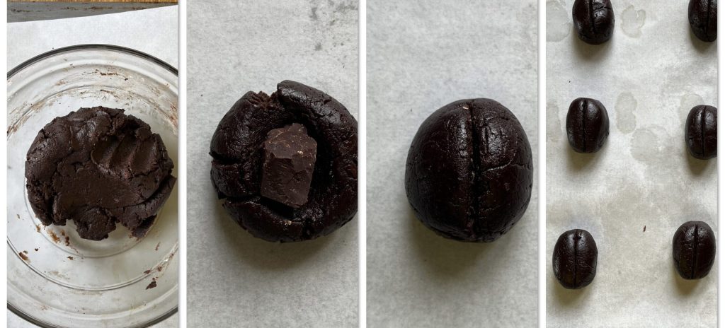 • Als het deeg de juiste consistentie heeft, vorm je bolletjes van ongeveer 3-4 cm, druk ze in het midden plat en plaats een stukje chocolade erin. Vorm er een ovaal van en trek een lange inkeping langs het midden om de vorm van een “koffieboon” te creëren.
