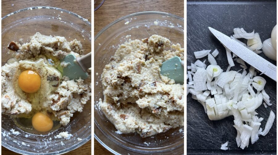 Voeg de eieren toe en meng goed. Zet even apart en bereid de overige ingrediënten voor. Schil en hak de ui fijn,