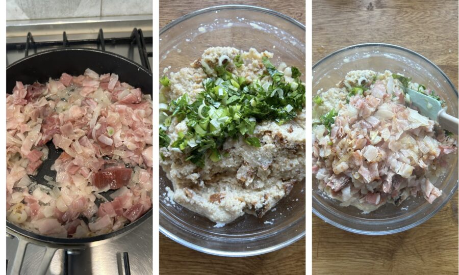 Laat dit ongeveer tien minuten zachtjes bakken terwijl je regelmatig roert, zet dan het vuur uit en ga terug naar het broodmengsel. Voeg de fijngehakte peterselie en bieslook toe. Voeg vervolgens ook de speck met de uien toe en