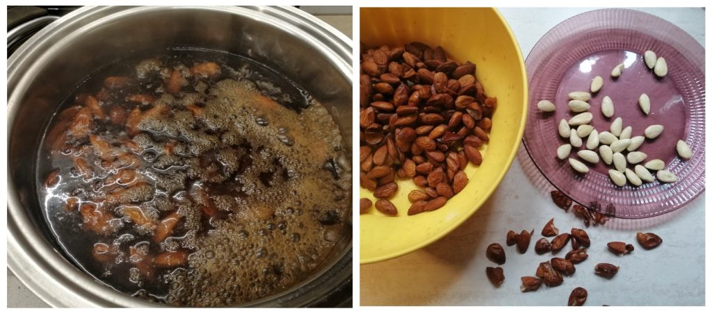• Je kunt amandelen al gepeld kopen, of met vlies. In dat laatste geval breng je een pan met water aan de kook, dompel je de amandelen erin, laat je ze 3-4 minuten rusten en giet je ze af. De huid zou dan zacht moeten zijn en je kunt ze gemakkelijk pellen.