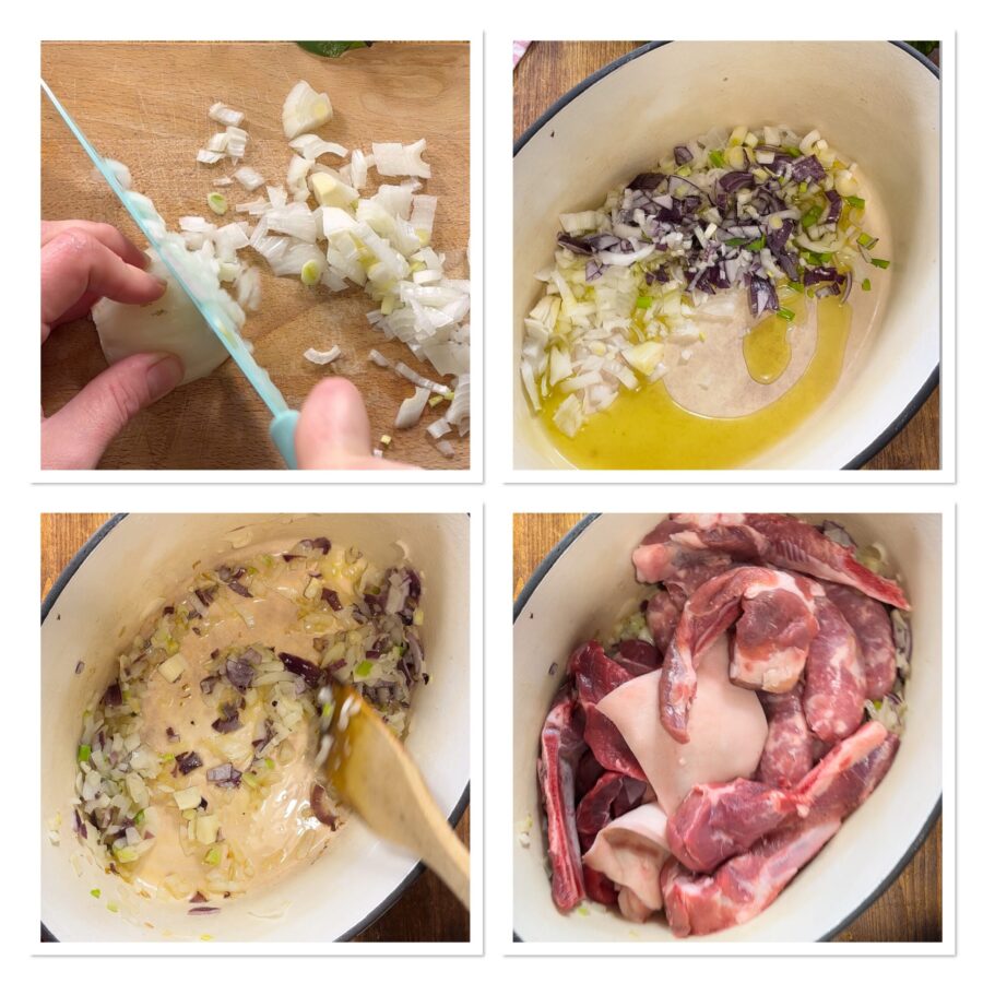 Bak ze glazig in een ruime scheut olie. Voeg het vlees toe en laat het aan alle kanten licht kleuren (ongeveer tien minuten).