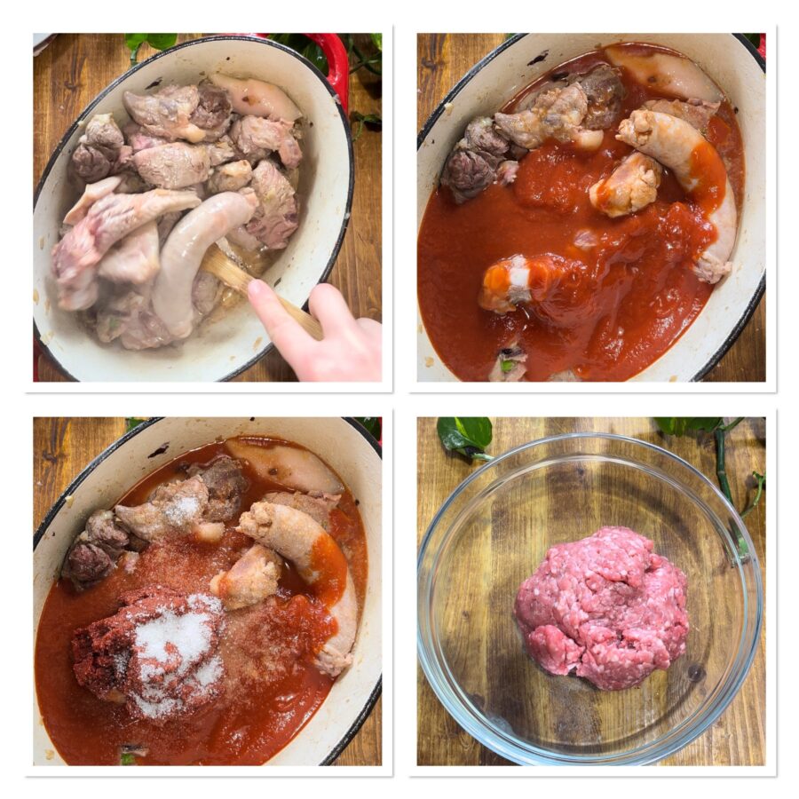 Voeg de gehaktballetjes toe aan de saus en laat nog een uur sudderen, en vergeet niet steeds voorzichtig te roeren.