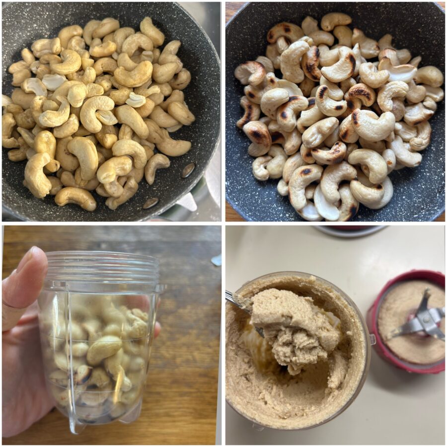 Om cashewboter te maken raad ik aan de cashewnoten kort te roosteren in een pan, in de oven of in de airfryer, net lang genoeg om wat kleur te krijgen en het aroma te versterken. Het is geen verplicht onderdeel van de bereiding, maar wel aan te raden.