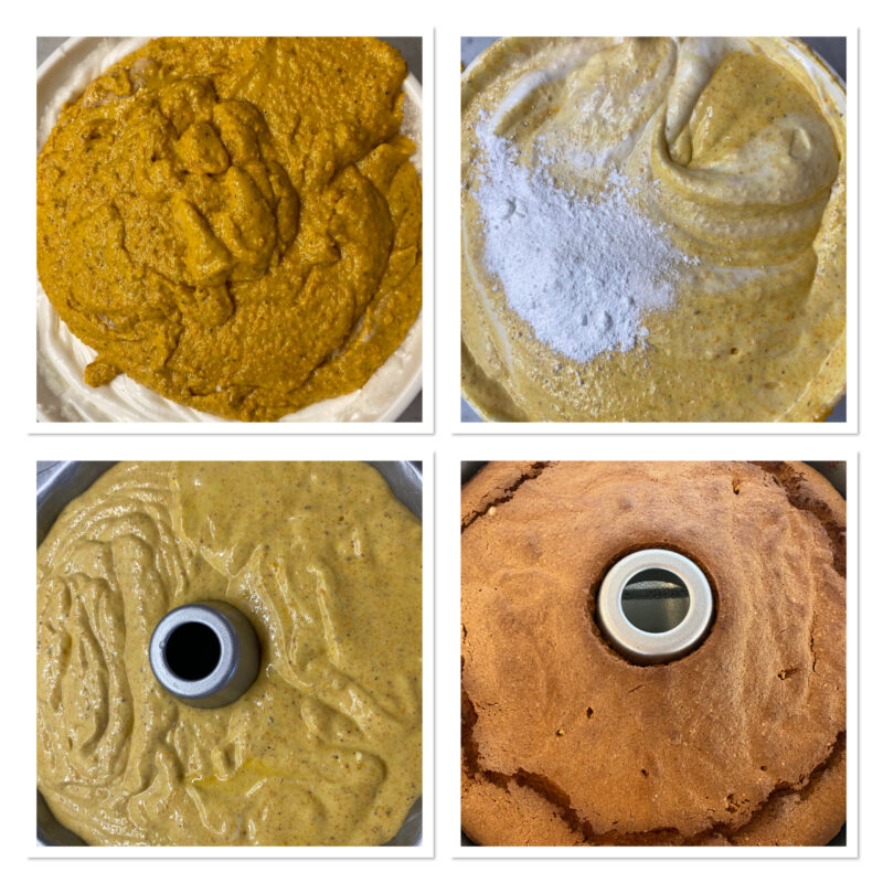 Giet het mengsel vervolgens in een tulbandvorm die ingevet en bebloemd is en bak op 170°C in heteluchtmodus; doe de satéprikker-test voordat je uit de oven haalt.