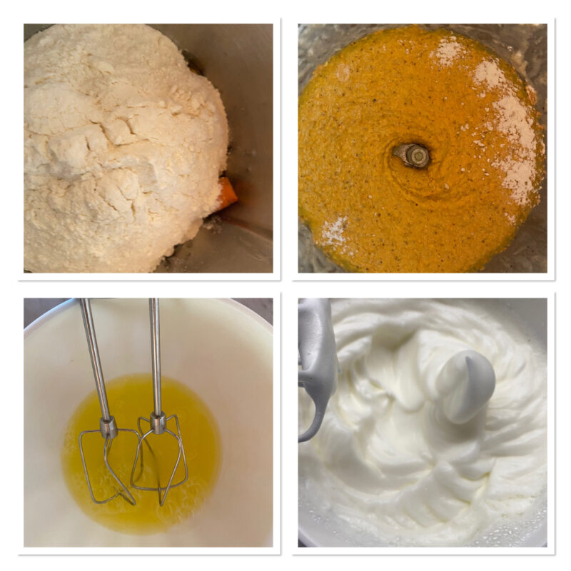 • Voeg het gemixte mengsel toe aan de eiwitten, met lichte bewegingen van boven naar beneden en spatel het erdoor, maak af door het bakpoeder toe te voegen.