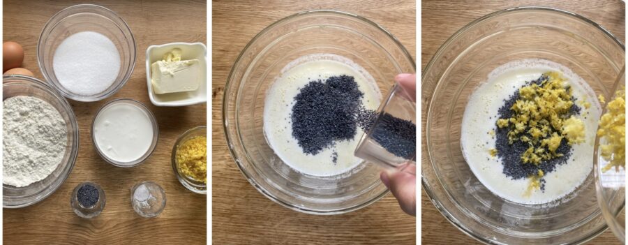 Voor de Citroen-maanzaadcake giet je de gesmolten boter in een ruime kom, voeg je het maanzaad en de geraspte schil van twee citroenen toe,