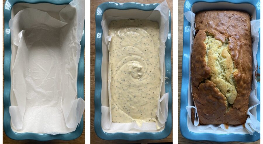 Bekleed een cakevorm met bakpapier, giet het beslag erin, strijk glad en bak in een heteluchtloze oven op 170°C gedurende 55 minuten. Doe altijd de satéprikker-test voordat je de cake uit de oven haalt.
