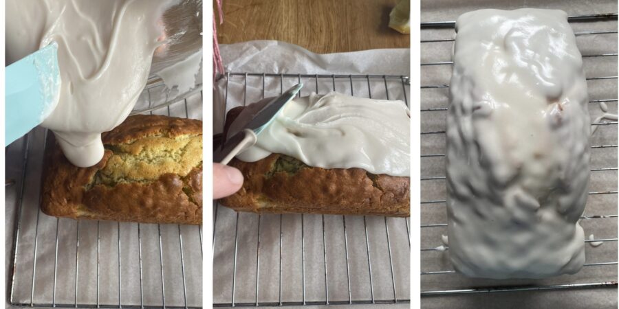 Giet het glazuur over de cake en verdeel het gelijkmatig met een spatel.