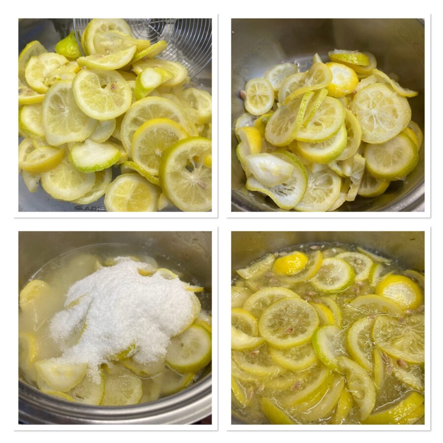 Na die tijd giet je de citroenplakjes af, breng een pan met voldoende water aan de kook en doe de plakjes erin. Kook de plakjes twee minuten, giet ze af, maar bewaar 350 ml van het kookvocht.