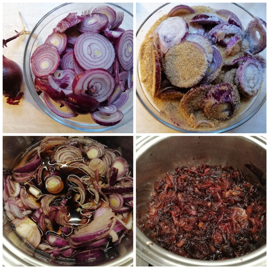 Een paar dagen later had mijn zus haar uienconfituur en samen proefden we een zoete herinnering opnieuw en van de rest van de uien maakte ik ook de rode uien in zoetzure saus in de pan.