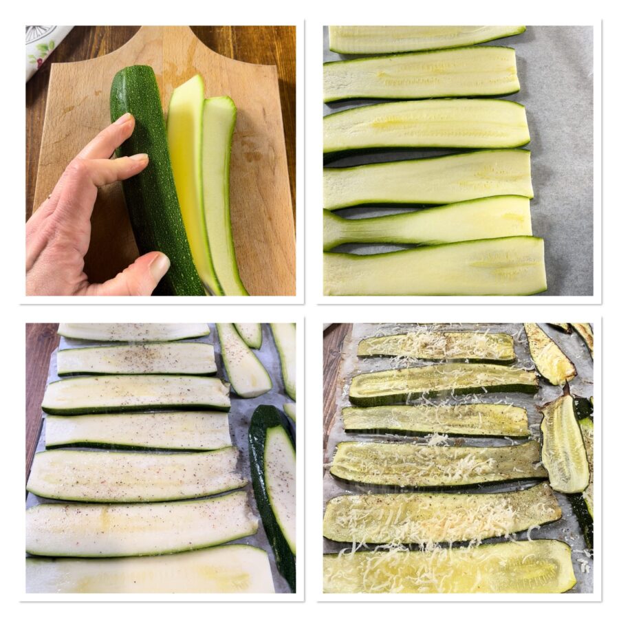 Spoel de courgettes af en verwijder de uiteinden, snijd ze in plakken van iets minder dan 1/2 cm dik en leg ze op een met bakpapier beklede bakplaat.