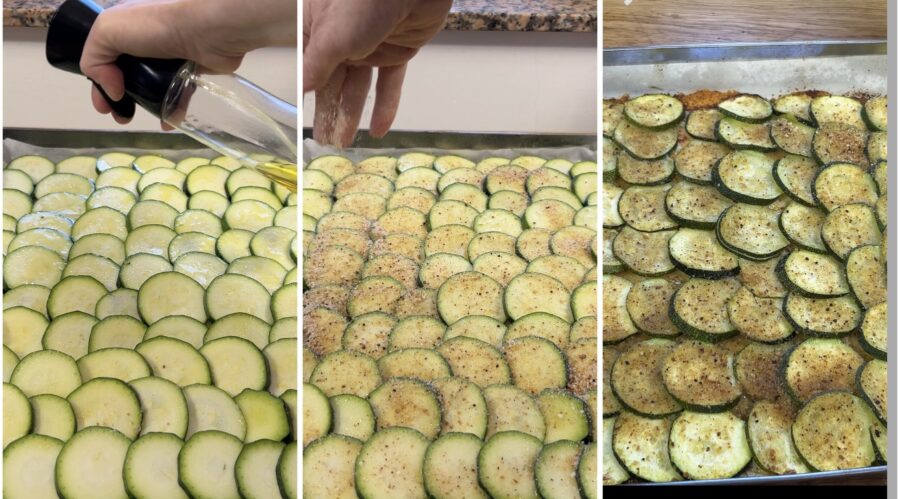 • Bekleed een bakplaat met bakpapier, verdeel de kaas gelijkmatig, strooi er wat paneermeel over en leg vervolgens de courgetteplakken dakpansgewijs zodat alles bedekt is. (Wees royaal met de kaas, anders blijven de courgettes niet aan elkaar plakken).