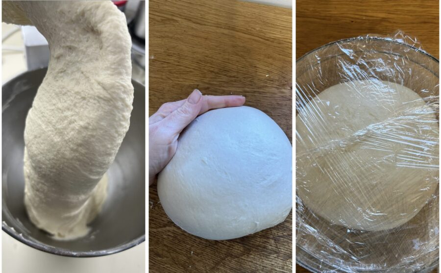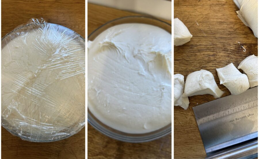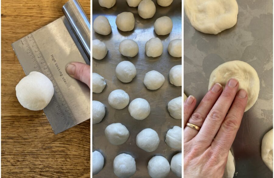 Vorm bolletjes en laat ze 20 minuten rusten op een warme plek (afgedekt met vershoudfolie), druk ze vervolgens lichtjes plat en laat nog 10 minuten rusten.