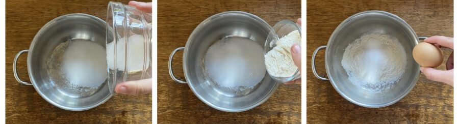 • Om de crostata met pure chocolade te maken, begin je met het bereiden van de vulling: combineer in een pan de droge ingrediënten die nodig zijn voor de crème en een ei.