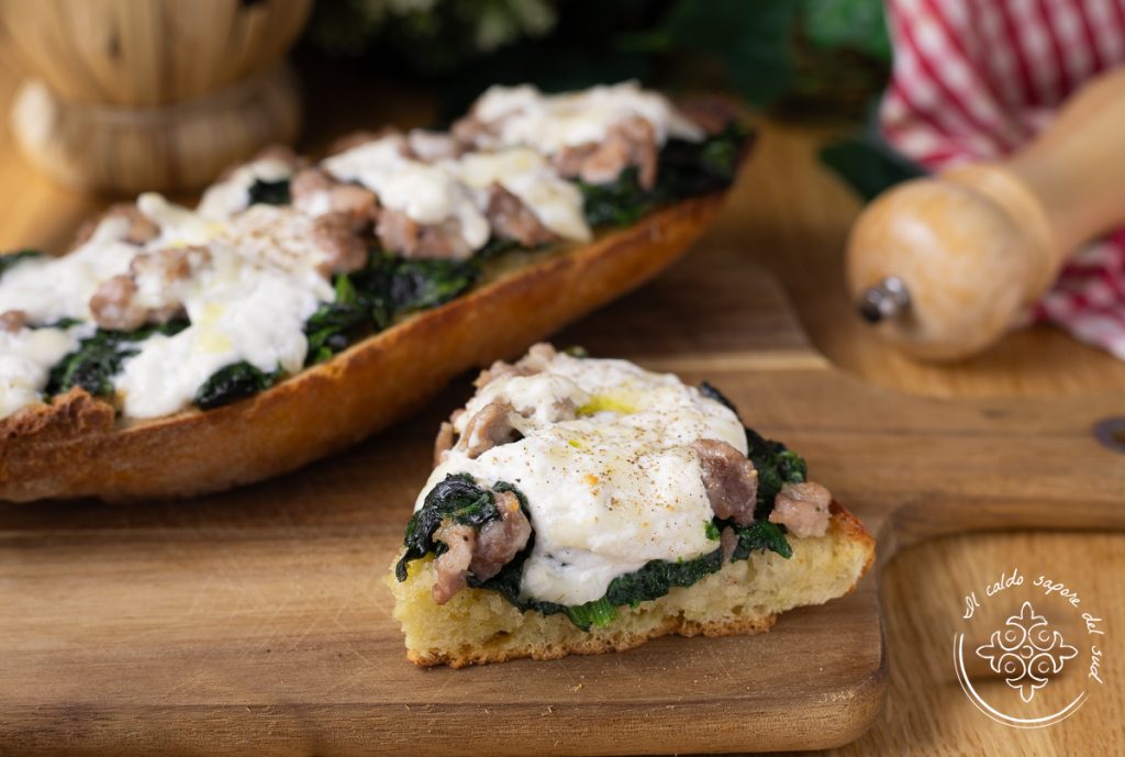 Om de crostoni uit de oven met worst en spinazie te maken, heb je brood van maximaal één of twee dagen oud nodig; je kunt elk type gebruiken, maar met lang brood of semola-brood worden ze nog lekkerder.