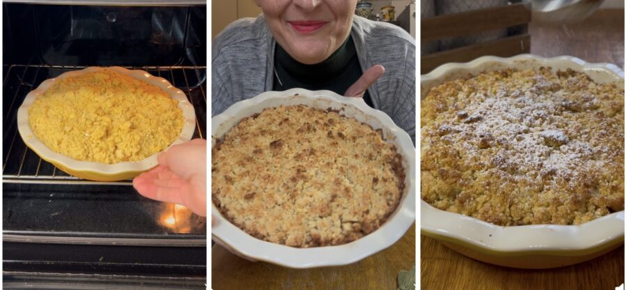 Appelcrumble volgens oma’s recept met appels, walnoten, kaneel en rozijnen, een dessert dat lijkt op de kruimeltaart met appels, maar veel makkelijker en sneller en een recept dat deel uitmaakt van onze grote verzameling Desserts met appels, en dat gegarandeerd in een mum van tijd van tafel verdwenen zal zijn. Stel je een krokante, krokante zanddeegkorst voor, heerlijk kruimelig, die een zachte en sappige vulling van appels en kaneel omsluit; dit is het basisrecept voor appelcrumble, maar wij maken het nog rijker en voegen walnoten, rozijnen en amaretti toe. Een soort bedekte appeltaart, maar zonder bodem, een dessert met een onweerstaanbare geur en een dubbele textuur, perfect bij het ontbijt, als tussendoortje en ik durf te zeggen ook als nagerecht, eventueel geserveerd met een lekkere vanille-ijs, alsof het een Amerikaanse apple pie is. Door de jaren heen maakten we veel zachte appeltaarten, maar ook appelbeignets, appelkoekjes en nog veel meer. Ik maakte al een heerlijke basis appelcrumble die jullie erg favoriet vonden, maar deze crumble met appels, walnoten, amaretti en rozijnen is uitzonderlijk geurend en rijk van smaak. Klaar om samen de keuken in te duiken? Laten we beginnen, maar voordat we de mouwen opstropen: als je op de hoogte wilt blijven van al mijn recepten kun je mijn Facebook-pagina (hier) en mijn Instagram-profiel (hier) volgen.