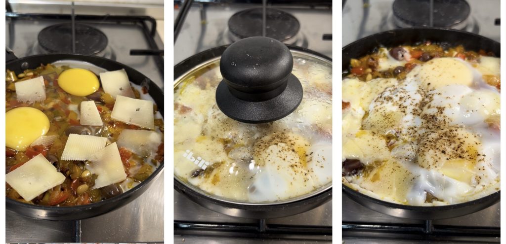 • Voeg de eieren bij de paprika’s samen met wat stukjes kaas naar keuze; ik koos voor Siciliaanse primo sale. Dek af en bak tot de gewenste consistentie is bereikt. Ik bakte ze 3 minuten; aan het einde voegde ik peper en basilicum toe en genoot ervan met vers brood.