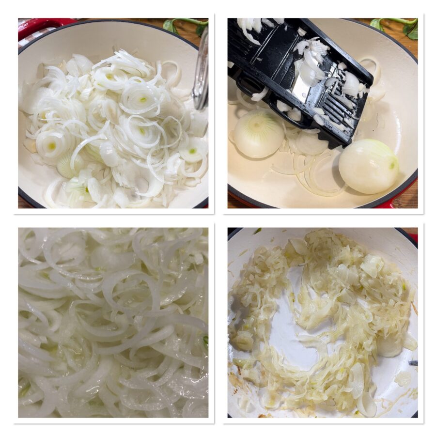 Schil de uien en snijd ze dun, ik raad aan een mandoline te gebruiken. Doe ze in een pan met dikke bodem, voeg het water, zout en olie toe en stoof ze op matig vuur, af en toe roerend. Als het water is verdampt, laat ze dan een beetje aanbakken en zet ze opzij.