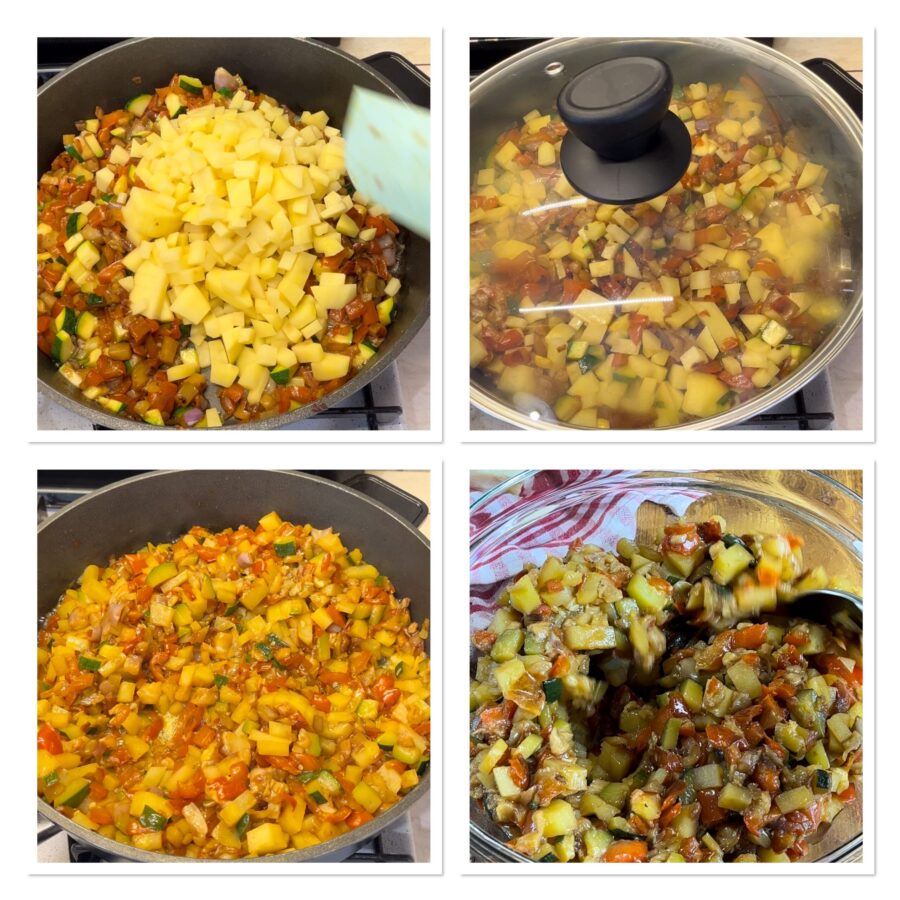 Kook nog 5 minuten en voeg dan de courgettes toe en pas na nog eens 5 minuten de aardappelen.