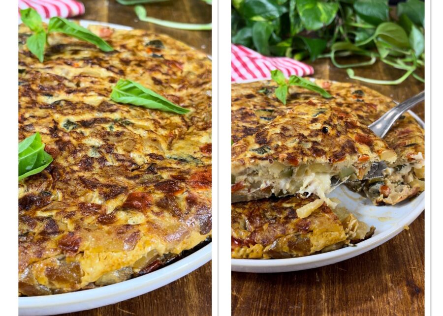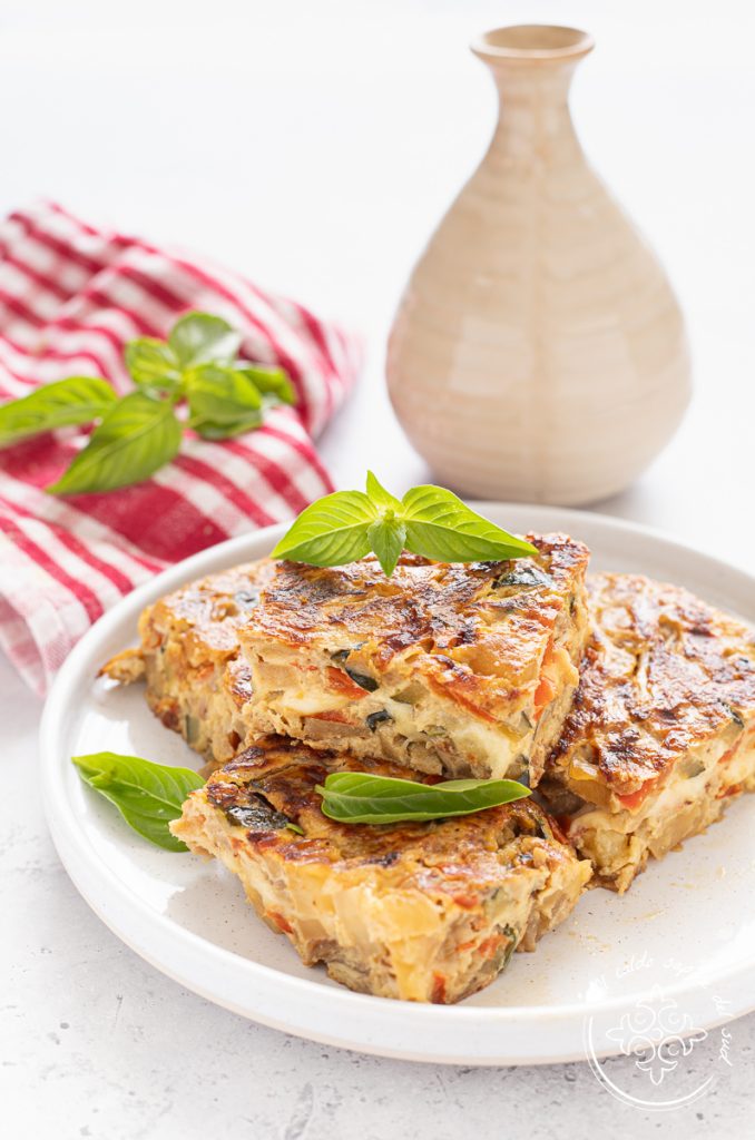 Frittata met gemengde groenten en kaas, gebakken in de pan of als lente‑frittata, een smaakvol vegetarisch hoofdgerecht of een verrassend voorgerecht. De frittata is dé redder van het avondeten; of het nu een aardappelfrittata, uitjesfrittata, paprikafrittata, pompoenfrittata of gewoon met alleen eieren is, de frittata is altijd lekker en maakt iedereen blij! Heb je in de koelkast wat overgebleven groenten, een beetje slap en die een tweede kans verdienen? Simpel, maak er een frittata van! Of je ‘m in de pan of in de oven bakt, het wordt altijd een succes en als je er ook wat gesmolten kaas tussen doet zoals in mijn courgettefrittata met kaas, zul je zien dat je in een paar stappen iedereen versteld zult doen staan!! Wist je dat deze frittata met gemengde zomergewassen ook wel lente‑frittata genoemd kan worden? Ja, want deze smakelijke frittata bevat veel groenten die je van het voorjaar tot en met oktober kunt vinden en als je wilt kun je, naast die in het recept, veel meer toevoegen zoals wortels, bleekselderij, bosui, prei, tuinbonen, doperwten, tomaten, enz. Maar aan de slag in de keuken: mouwen opstropen; het lekkere recept om onze overgebleven en ietwat verwelkte groenten te gebruiken wacht op ons. Onthoud dat je de lente‑frittata natuurlijk ook met verse groenten kunt maken!! Ik herinner je eraan, voordat je begint met koken, dat je, als je op de hoogte wilt blijven van al mijn recepten, mijn pagina op facebook en mijn profiel op Instagram kunt volgen.