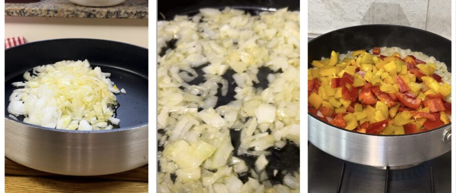 Bak de ui glazig in olijfolie, voeg de paprika’s toe, breng op smaak met zout en laat 20 minuten zachtjes stoven op middelhoog vuur, regelmatig roeren.