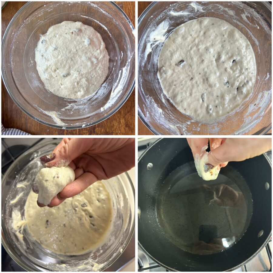• Roer met een lepel 5 minuten tot een elastisch en homogeen mengsel, zet het warm om te rijzen gedurende minstens 90 minuten, of in elk geval tot het verdubbeld is. Na de rijstijd en als de rijs voltooid is, verhit je een pan met ruime hoeveelheid olie en met behulp van natte handen of een lepel schep je kleine porties deeg en laat je ze in de hete olie vallen (170°C).