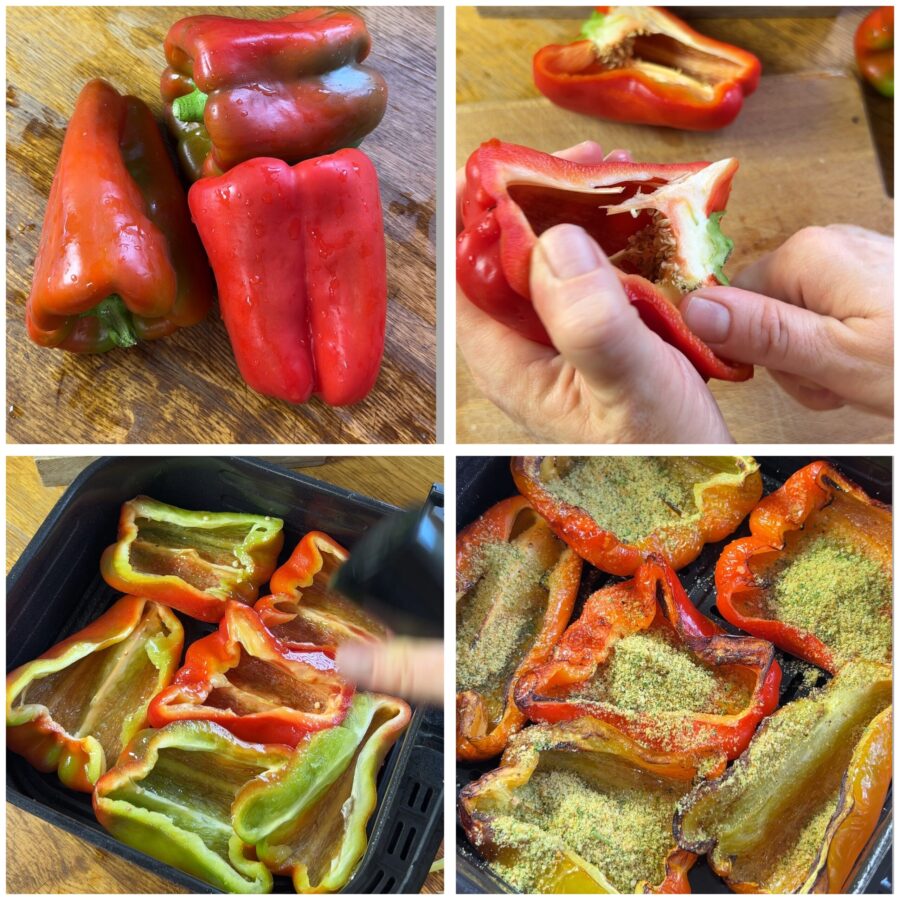 • Spoel de paprika’s, halveer ze, verwijder de zaadjes en de zaadlijsten en leg ze in een ovenschaal met de open kant naar boven of op het rooster van de airfryer