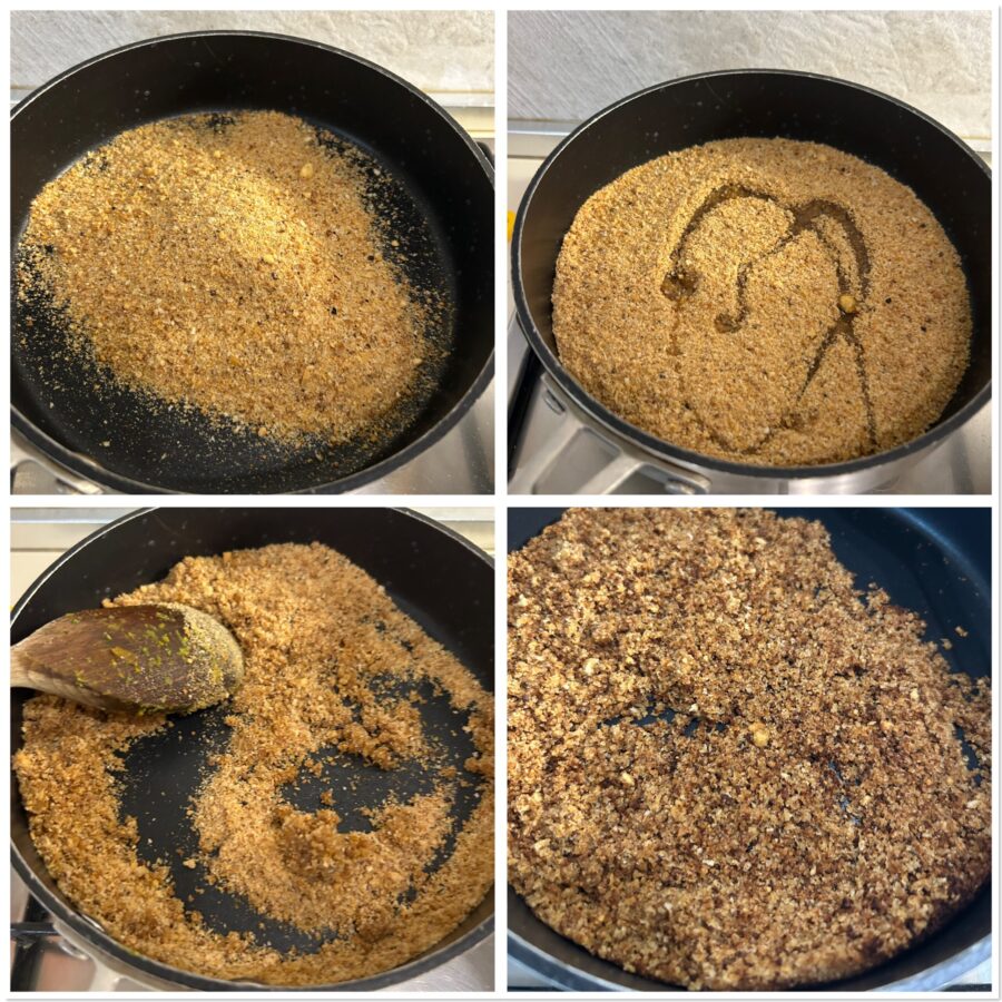 • Ik heb verse pasta gebruikt; die houdt de bereiding beter en is smaakvoller. Voeg 2/3 van de broccolipuree en de helft van de geraspte kaas toe en meng. Verdeel wat ‘muddica atturrata’ (ik leg hieronder uit hoe je het maakt) op de bodem van een ovenschaal, giet de helft van de pasta erin, spreid wat broccolipuree uit en verdeel geraspte kaas en daarna…