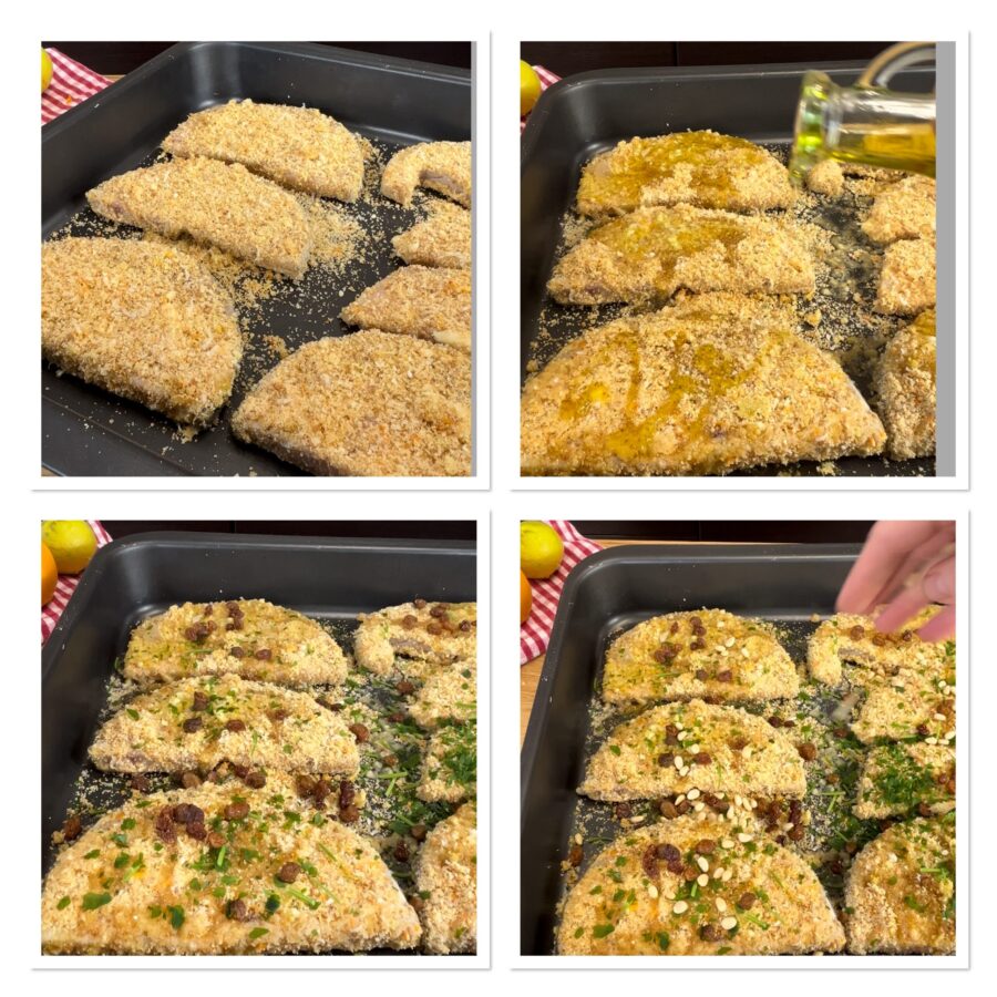 Leg de filets in een ovenschaal en laat ze 10 minuten marineren met olijfolie, het sap van 2 sinaasappels (ongeveer 60 ml), het sap van 1 citroen en een beetje geraspte schil van beide citrusvruchten. Maak een paneerlaag met het paneermeel, de geraspte kaas, sinaasappelrasp en citroenrasp, voeg een goede scheut olie toe en meng.