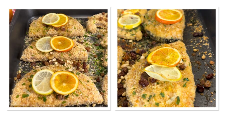 leg op elk stuk een schijfje citroen en een schijfje sinaasappel. Bestrooi met een beetje zout en bak in een voorverwarmde oven op 200° gedurende 15-20 minuten (als de filets iets dikker zijn dan een centimeter; voor dunnere filets verkort de bereidingstijd). Zodra er een goudbruine korst is gevormd, haal je ze uit de oven en serveer je ze. De gegratineerde zwaardvis met citrus is heerlijk warm en ook lekker lauw; ik raad af om hem koud te eten.