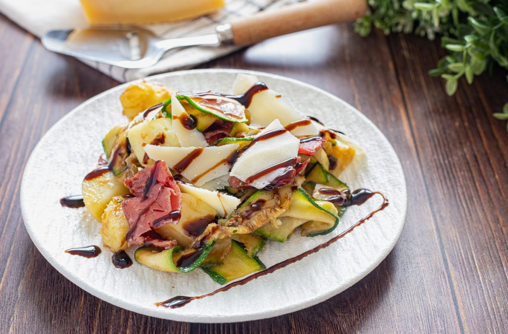 Gegrilde courgettesalade met bresaola. De salade van gegrilde courgettes met bresaola, aardappelen en Grana is weer een idee om toe te voegen aan onze verzameling van makkelijke en snelle courgetterecepten, net zo lekker als het recept voor de courgette-piadina in plakjes of de gegrilde courgettesalade. Licht, voedzaam, smaakvol en gemakkelijk te maken, de salade van gegrilde courgettes met aardappelen en bresaola is een volwaardige en lichte eenpansschotel, ideaal voor een maaltijd buitenshuis, aan zee, op kantoor of tijdens een picknick, maar ook perfect voor een lichte zomerse avondmaaltijd of als alternatief voor een smaakvolle aardappelsalade, rijk en compleet. Om hem te maken hoef je alleen de courgettes heel snel te grillen, in zeer dunne plakjes gesneden met een dunschiller of mandoline, zoals bij het maken van een courgettecarpaccio, en daarna de overige ingrediënten toe te voegen en af te werken met een goede scheut olie en balsamico-glazuur. Nu de keuken in: onze grote gegrilde courgettesalade wacht op ons, maar eerst wil ik jullie, zoals altijd, herinneren dat als je op de hoogte wilt blijven van al mijn andere recepten, je mijn Facebookpagina en mijn Instagramprofiel kunt volgen.