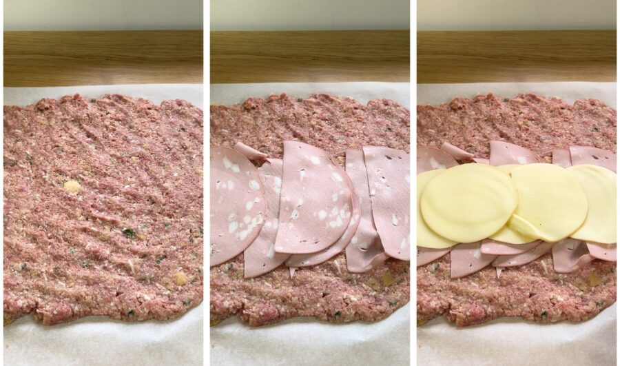 • Leg een vel bakpapier op het werkvlak, verdeel het mengsel erop en vorm het in een rechthoek van ongeveer 30 cm x 25 cm. Leg daarop, iets lager dan het midden, de plakjes mortadella en de provola