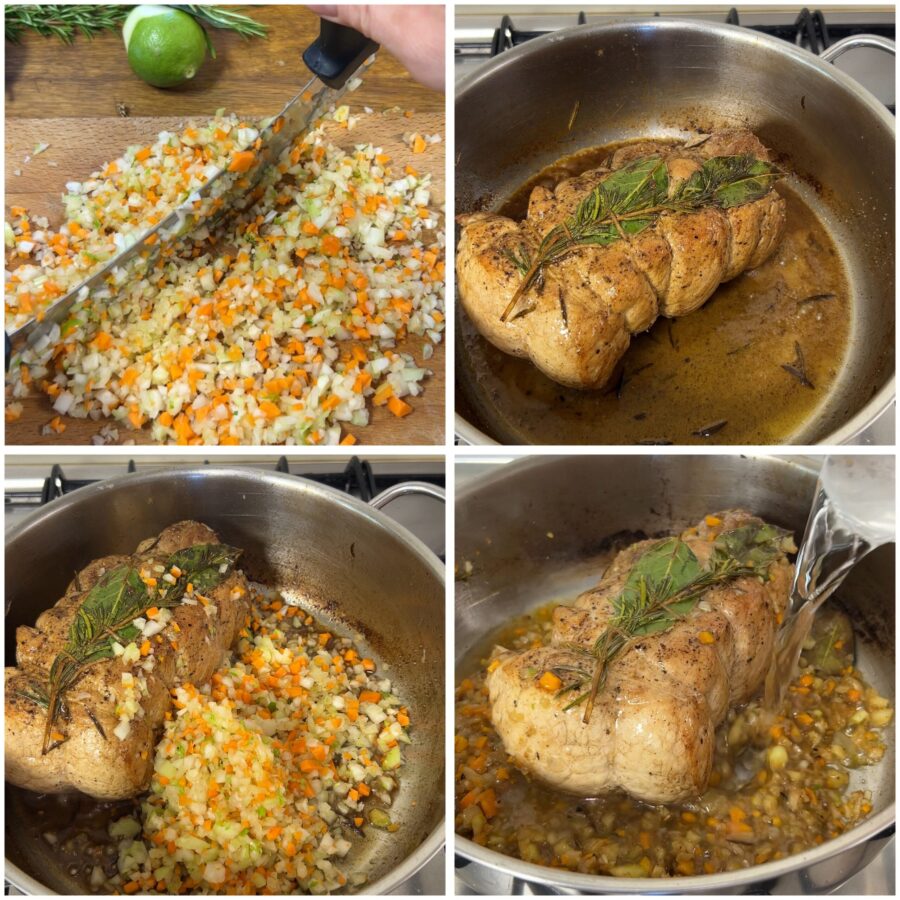 Giet de wijn erbij en blus af, laat deze volledig verdampen en bedruip het vlees regelmatig met het braadvocht. Maak een fijngehakt mengsel van selderij, wortel en ui en voeg dit toe aan het braadstuk.