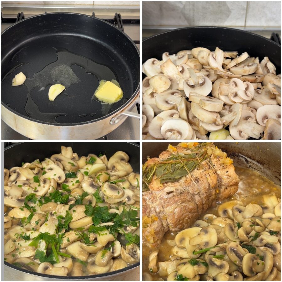 Als het gehakte groentemengsel is geslonken en aangebraden in het braadvocht (dat ook de aan het begin toegevoegde boter bevat), giet dan een vol glas water erbij, doe de deksel op de pan, laat het geheel weer zachtjes koken en zet het vuur laag. Ga door met garen gedurende minstens 30 minuten en bereid ondertussen de gebakken paddenstoelen. Doe in een pan de boter, de knoflook en de olie, laat de knoflook geuren en voeg de schoongemaakte en in plakjes gesneden paddenstoelen toe. Breng licht op smaak met zout en zodra ze in volume zijn gereduceerd voeg je de fijngehakte peterselie toe, meng ze vervolgens door het braadstuk.