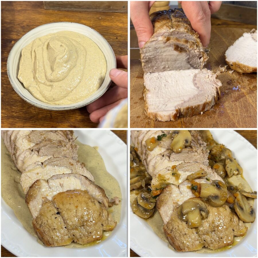 Bereiding van de geroosterde lende met paddenstoelencrème