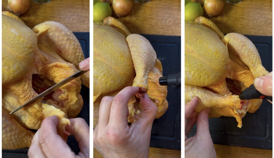 Begin met het voorbereiden van de kip: verwijder eenvoudig de stukjes vet die zich aan de onderzijde bij de staart bevinden (maar verwijder de staart niet). Verwijder eventueel aangebrande veertjes met een brander of aansteker.