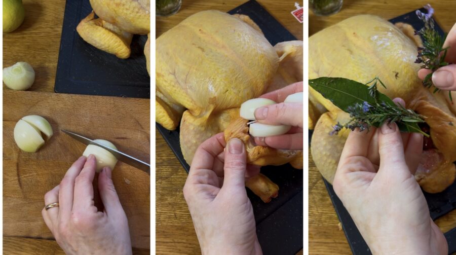 Schil, spoel en snijd de uien grof en stop ze in de kip samen met een takje rozemarijn en drie laurierblaadjes.