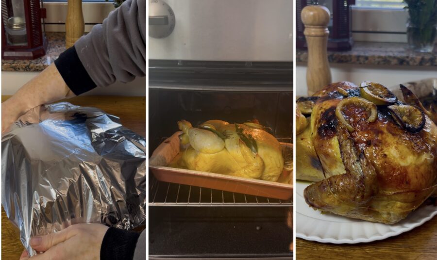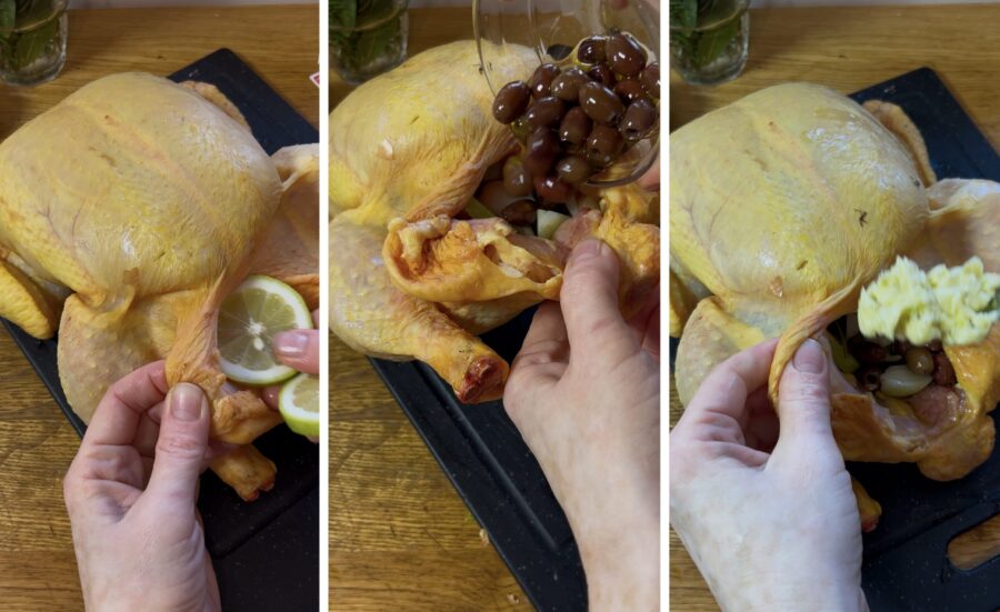 Voor dit recept kocht ik een grote kip van 3,700 g en heb ik hem iets meer dan 3 uur laten garen. Houd er rekening mee dat het ongeveer een uur per kg kip nodig is om te garen, dus voor kleinere kippen kun je de tijden verkorten.