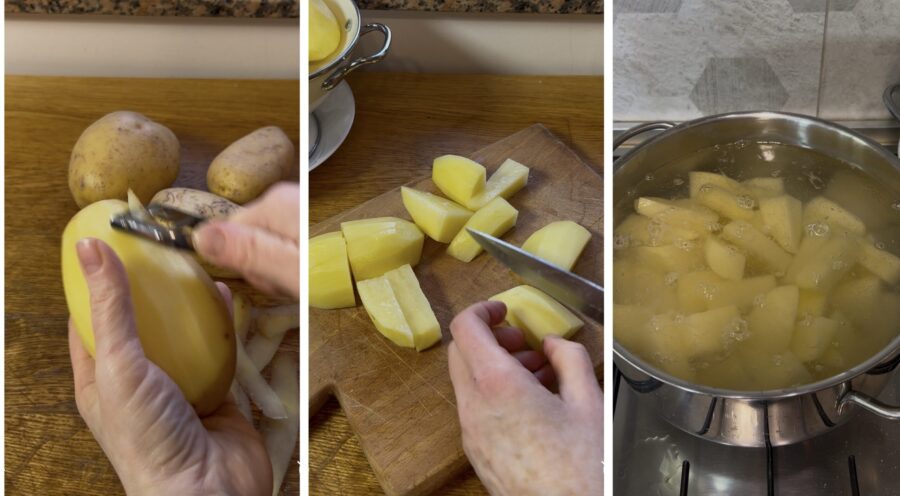 Terwijl de kip gaart, bereid je het bijgerecht. Schil de aardappelen, spoel ze af, snijd ze in stukken en blancheer ze 7-8 minuten in lichtgezouten kokend water.