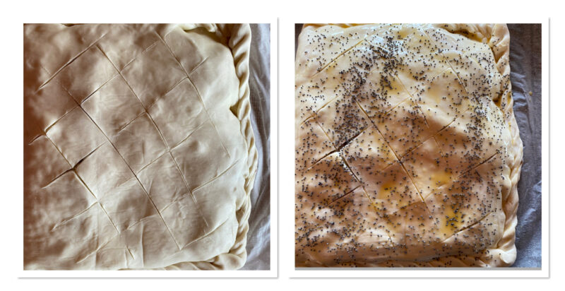 Bestrijk met geklopt ei, bestrooi met wat zaden, maak kleine sneetjes in het oppervlak om te decoreren en om stoom te laten ontsnappen, en bak in een heteluchtoven op 180°C gedurende ongeveer 20-25 minuten of totdat u de gewenste goudbruining hebt bereikt.