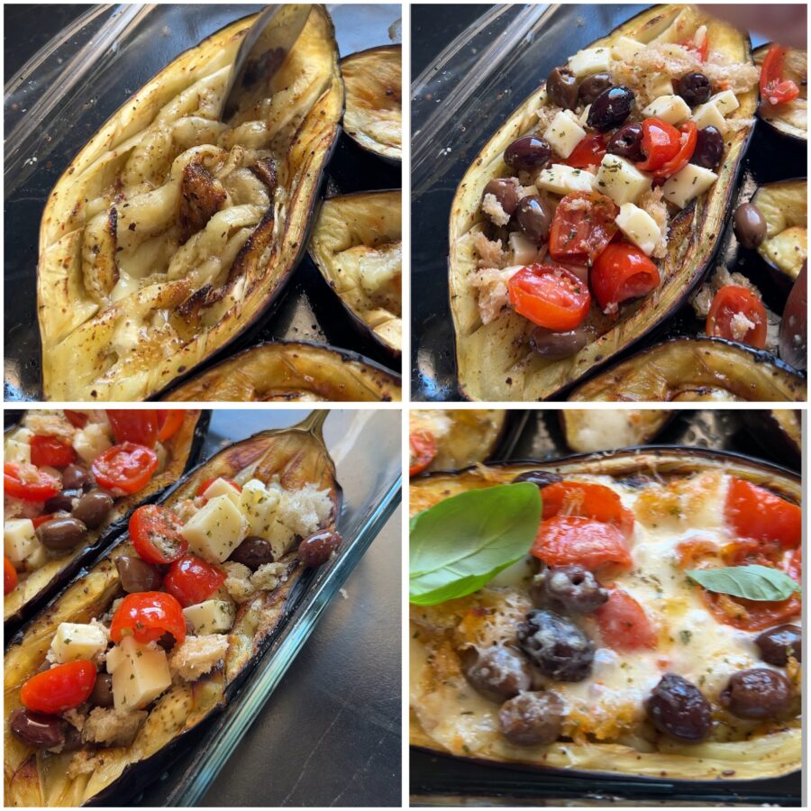 Dit is een gemakkelijk recept, perfect zowel als hoofdgerecht op basis van groenten als licht éénpansgerecht en vegetarisch. Gevulde aubergines uit de oven kun je van tevoren maken; je kunt ze warm serveren, maar ze zijn ook erg lekker lauw, wanneer de smaken gerijpt zijn en intenser worden. Het zijn eigenlijk kleine zachte bootjes die klaar zijn om de vulling te ontvangen.