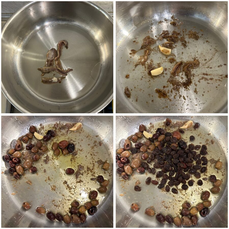 Voeg de olijven toe en laat ze een paar minuten meebakken, daarna voeg je de rozijnen toe. Meng voorzichtig zodat de smaken elkaar kunnen ontmoeten.
